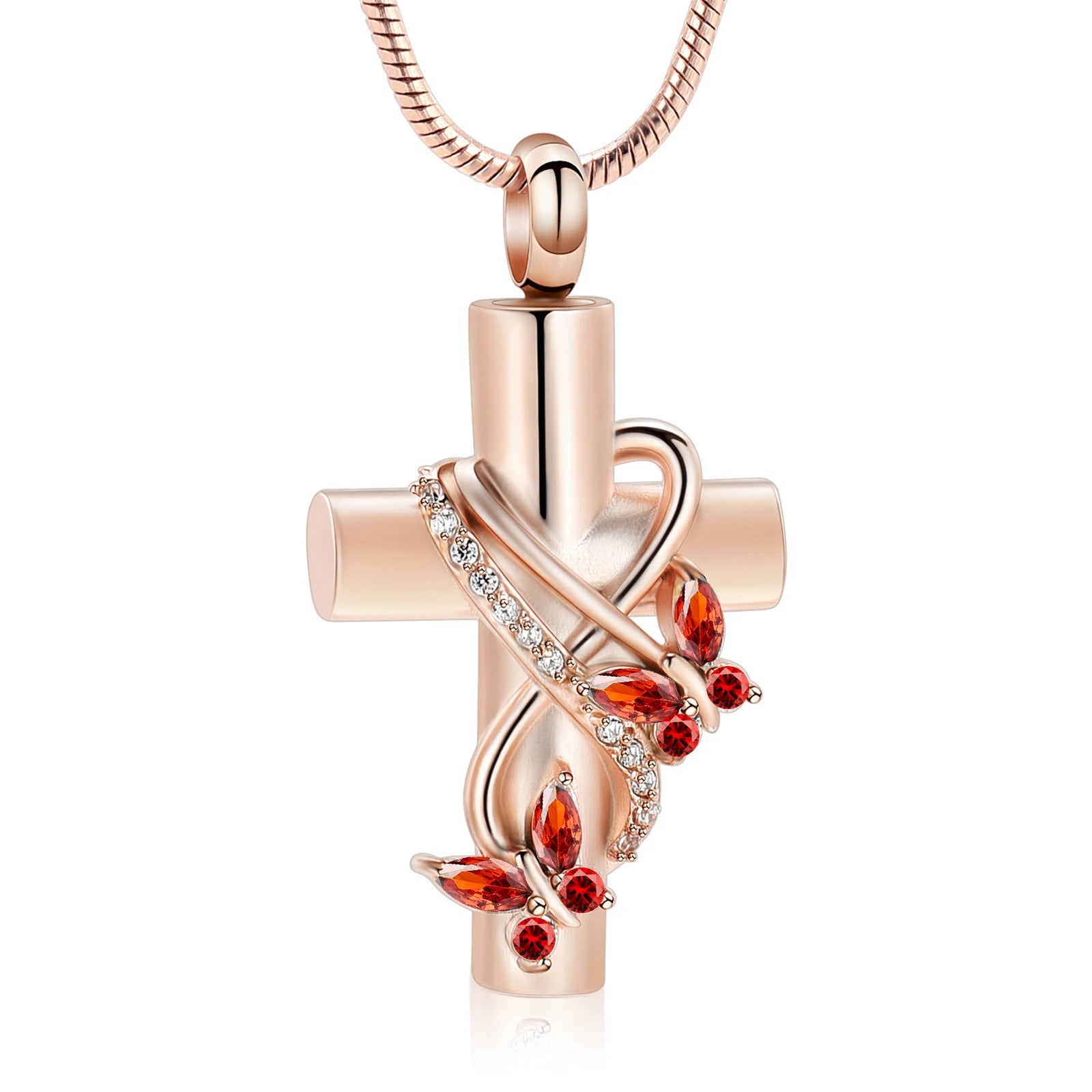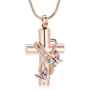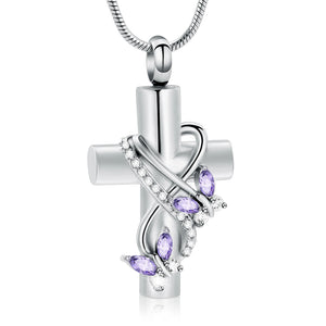 Embrace the memory of your loved one with the stunning Butterfly Vine Cross Cremation Necklace, a heartfelt and elegant keepsake. This beautifully designed necklace features a cross wrapped with intricate vines and butterflies, symbolizing the cycle of life, growth, and transformation. Sparkling color crystals embellish the vine and butterfly wings, creating a vibrant, eye-catching tribute that celebrates the beauty of life’s journey.