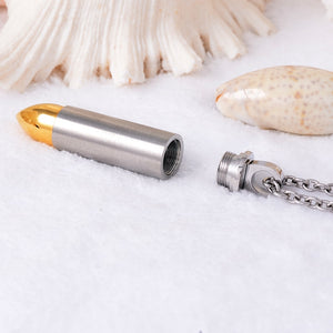 This bullet shaped cremation necklace/pendant comes with your choice of a black or gold tip. Crafted from high quality stainless steel, the bullet pendant can hold ashes, dried flowers, sand, hair, or other meaningful keepsakes. A perfect necklace to memorialize your soldier, hunter, or police officer.